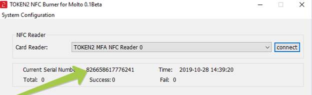 - Then, place the token onto the NFC module and wait for its serial number to appear.